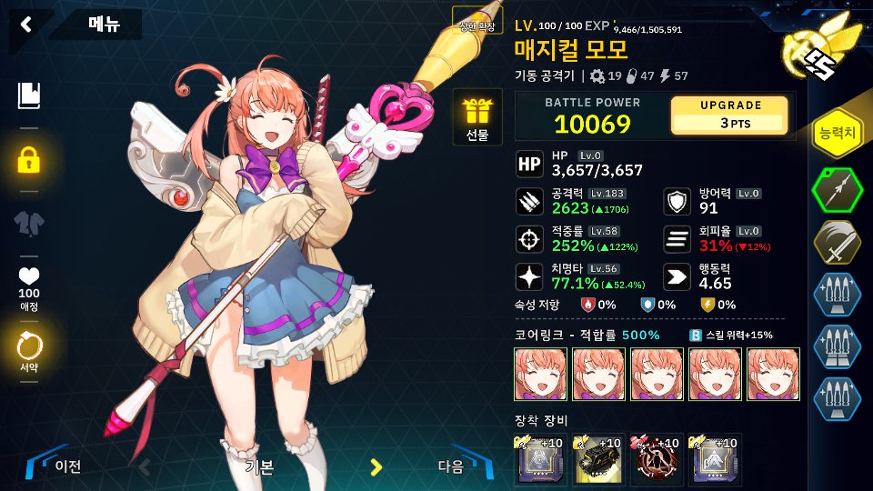 그래서 메카닉 3명 넣은거 다시 다 빼고 빨붐 잡는 용도로 미호를 넣어서 골타에 반격 버프 넣어주고 뽀끄루 들어간 김에 딜러로 마법소녀 중 하나인 모모를 넣었습니다.