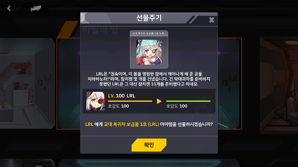 게임내 스토리를 진행하며 그리고 위의 대사처럼 참치캔 = 좌우좌 라는 생각이 들만큼 참치캔 식탐으로 상징같은 캐릭인데 이런 참치캔 선물로 인해 게임 내 설정에서 좌우좌가 사령관에 대한 애정과 유저 입장에서 이번 이벤트 스킨은 조금 비싼데? 라는 생각을 가진 사람에게 커다란 반전까지 주는 굉장한 장치라 생각이 된다.