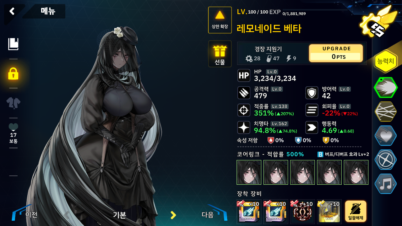 제 경우는 남은 한자리 누구 데려갈가 고민하다가 전격 및 화염 속성이 있는 덱이다 보니 베타를 데려갔습니다.